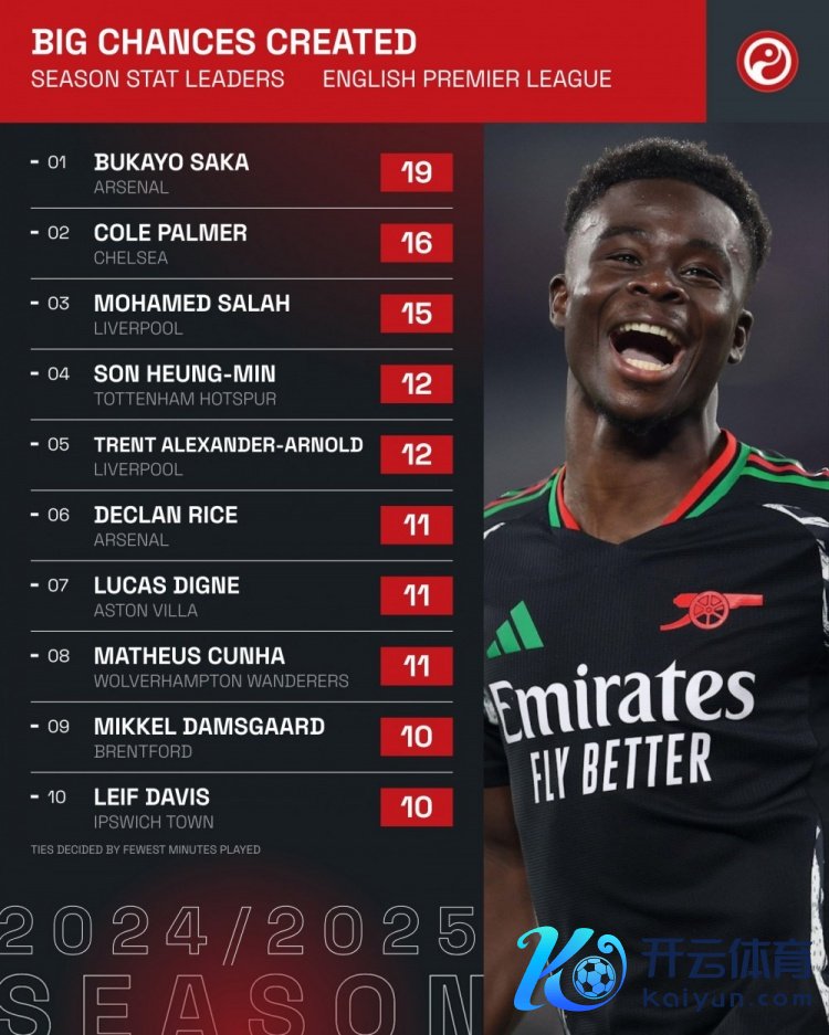 1月6日讯 Squawka统计了球员本赛季在英超创造要紧契机的次数,并排出榜单,缺席近3场联赛的萨卡仍以16场创造19次要紧契机领跑,帕尔默创造16次要紧契机排排名席。