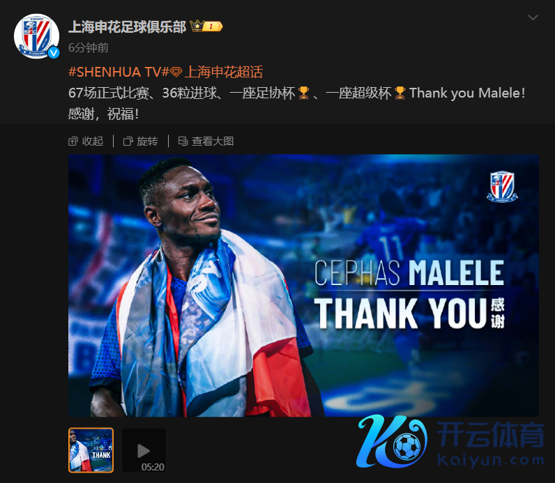 “67场进展比赛、36粒进球、一座足协杯、一座超等杯Thank you Malele!感谢,祝愿! ”