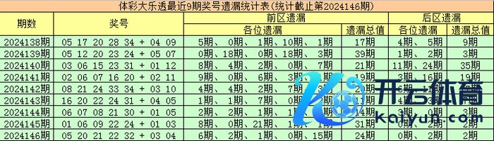 上期总结:体彩大乐透第2024146期开出奖号为:05 20 21 22 32 + 03 04体育赛事直播,其中前区诸君奖号诀别遗漏:6期、2期、1期、0期和15期,遗漏总值为24期,后区号码诀别遗漏0期和2期,遗漏总值为2期。